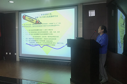 活动特别邀请了中科院山地灾害与地表过程重点实验室王裕宜研究员作了“沐浴在国家改革开放的阳光里——同心深耕中国梦,砥砺奋斗写华章”的主题报告。她在报告中介绍了东川泥石流观测研究站老一辈科学家在不通电、不通水、基础设施薄弱、工作生活条件艰苦的野外艰难建立泥石流半自动化观测试验体系的过程,以及老一辈科学家们以顽强的意志克服重重困难、采集科研数据、完成科研任务的过程,回顾了自己在观测初期采样过程中一次与泥石流生死搏斗的经历,让同学们切身体会了老一辈科学家开展科研工作的艰辛与不易。此外,她分享了在东川站工作期间大量的靠实践迸发创新思维的小故事,并介绍了她在广泛参与学术交流与合作中的收获和感悟。她鼓励青年学子们,机会是留给有准备的头脑,要对科研工作保有一份敬畏、一份感激和一份热爱。