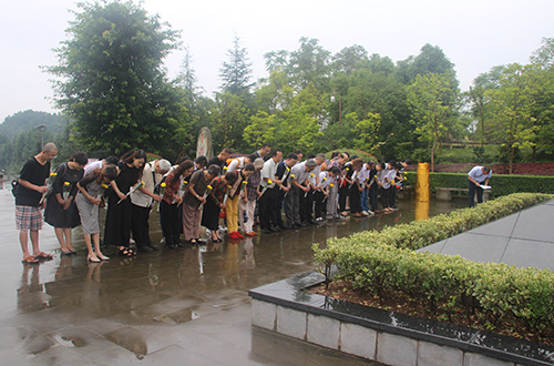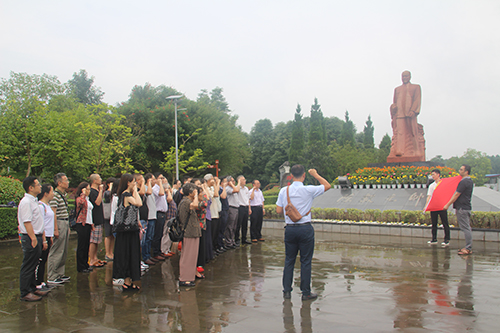 天空中飘落着蒙蒙细雨,即使如此也没能挡住生物所一行人瞻仰元帅风采的热情。在依山而建的广场上,在陈毅元帅雕像前,全体党员面对党旗庄严肃立,紧握右拳用响亮的声音重温入党誓词,在党旗下接受心灵的净化和洗礼,牢记共产党员的初心和使命。紧接着,大家依次向陈毅元帅雕像献花致意。