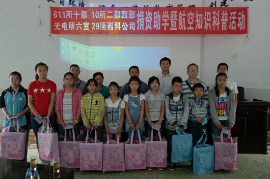 本次活动由包括光电所六室在内的四个兄弟单位联合发起,今年已进入第四个年头。活动开始前,名山县县委领导代表名山县对几年来四家单位的爱心资助表示感谢,并对各单位派专人进行现场捐助和实地家访表示赞赏。随后光电所科技处副处长高晓东对资助项目的起源和发展进行了介绍。上午10点活动正式开始。首先是捐助仪式,光电所职工代表以每人800元的标准将爱心助学金送到了名山县万古乡九年一贯制学校受资助的13名贫困儿童手中,同时也为他们带来了书包、文具、书籍等学习用品。资助活动结束后工作人员还为在场同学及家长进行了航空知识科普讲座和场外航模飞行表演。