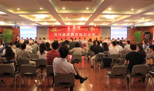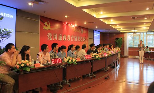 为了迎接建党90周年,宣传学习党的十七大以来中央关于反腐倡廉的路线、方针、政策,以及党章、党纪政纪条规和廉政知识,结合创先争优活动的开展,进一步增强职工参与反腐倡廉工作的积极性和主动性,5月13日,成都分院纪检组举办了一次别开生面的党风廉政教育知识竞赛。本次竞赛由分院系统党委书记、纪委书记为仲裁、评审委员会,光电所党办副主任周鹏浩主持竞赛。各单位党务、纪监审干部、课题组代表等80余人参加了竞赛活动。