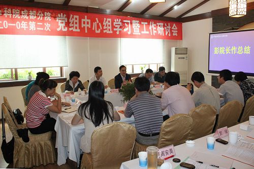 为深入学习贯彻全国两院院士及院人才工作会议精神,全面落实成都分院2010年重点工作,成都分院党组于6月29日至30日召开了中心组专题学习暨工作研讨会。成都分院院长彭宇行,党组书记、副院长袁家虎,副院长赵永涛,党组副书记、纪检组组长彭丽玲,高级业务主管杨文明,高级业务主管、院长助理张一红及机关处级以上干部参加了会议。彭宇行和袁家虎分别主持了会议。