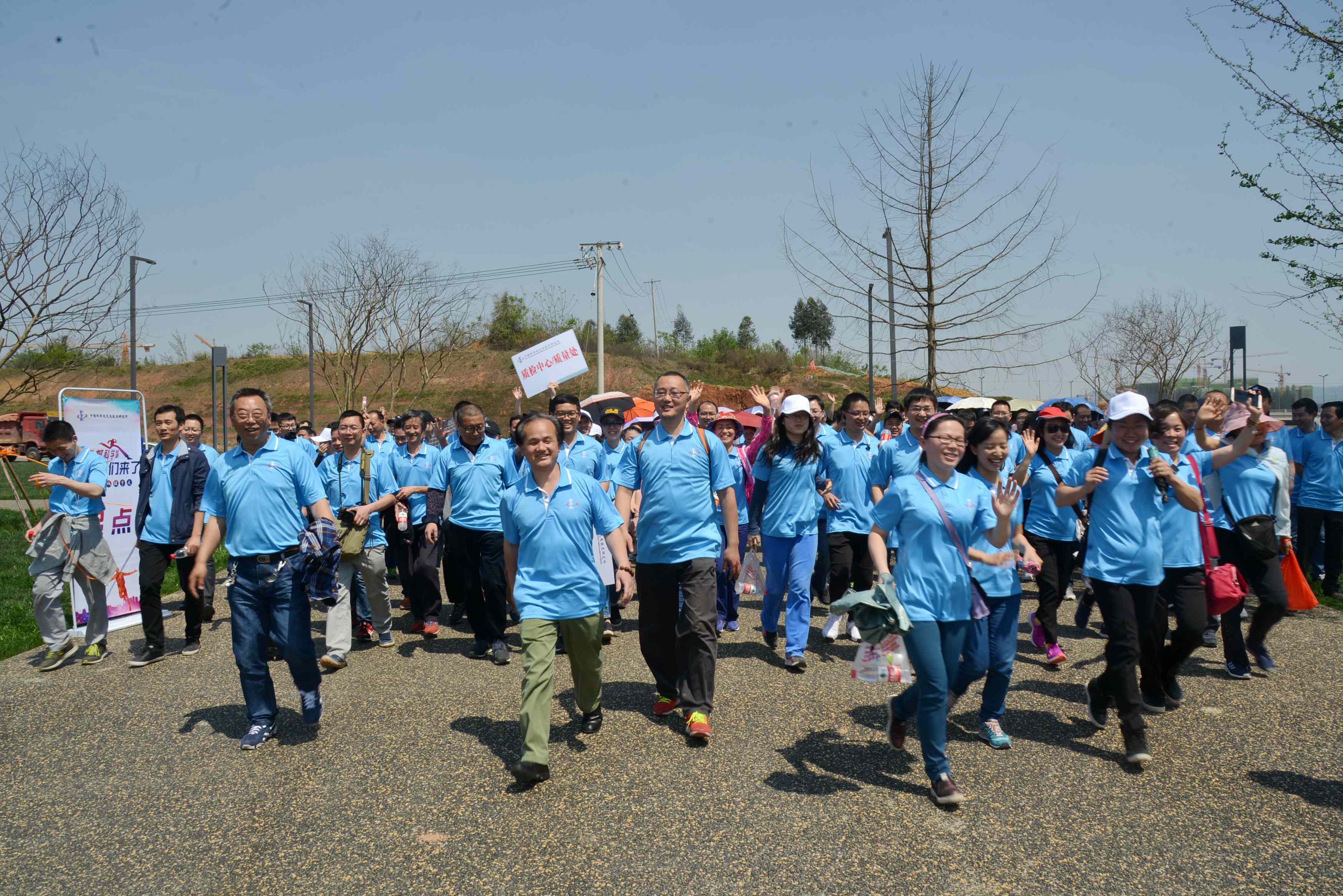 健步走环节环兴隆湖进行,起点为科学城东门,终点为科学城西门,全程约4公里。环湖可欣赏科学城的自然风光,了解已落户科学城的高精尖科研单位,也可与同行者畅聊研究所未来发展,分享新时代下国家科技事业快速发展的欢愉心情。放眼望去,光电所活动人员组成的健步走队伍犹如一条蓝色丝带,在阳光的照耀下与兴隆湖湖水交相辉映,组成了一幅春日里的美好画卷。