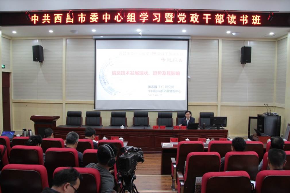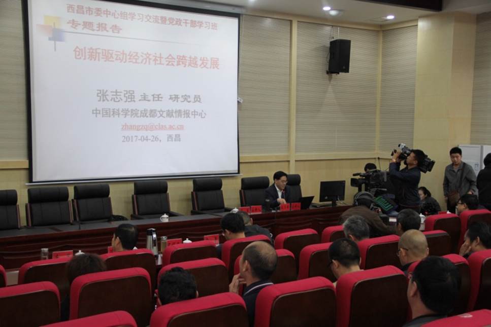4月26日和27日,中国科学院成都文献情报中心主任张志强研究员受四川省西昌市委邀请,为中共西昌市委中心组学习暨党政干部读书班作了两场专题讲座报告,两场报告的题目是《创新驱动经济社会跨越发展》和《信息技术发展现状趋势及其影响》。西昌市委、市政府、市人大、市政协等四大班子的党政领导干部,市委市政府各部门党政主要负责人,各乡镇、街道党政主要负责人等130余人参加学习会和读书班听取了报告。两场报告会由西昌市委常委、宣传部部长唐军主持。