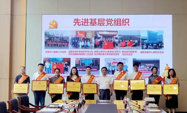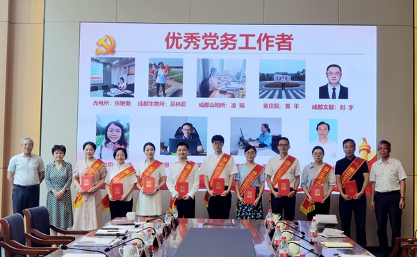 陈锋宣读表彰决定。杨薇薇等25名优秀共产党员、侯方等10名优秀党务工作者和成都分院机关第一党支部等10个先进基层党组织获得表彰。参会领导分别为受到表彰的先进集体和优秀个人颁发了荣誉证书和奖牌。