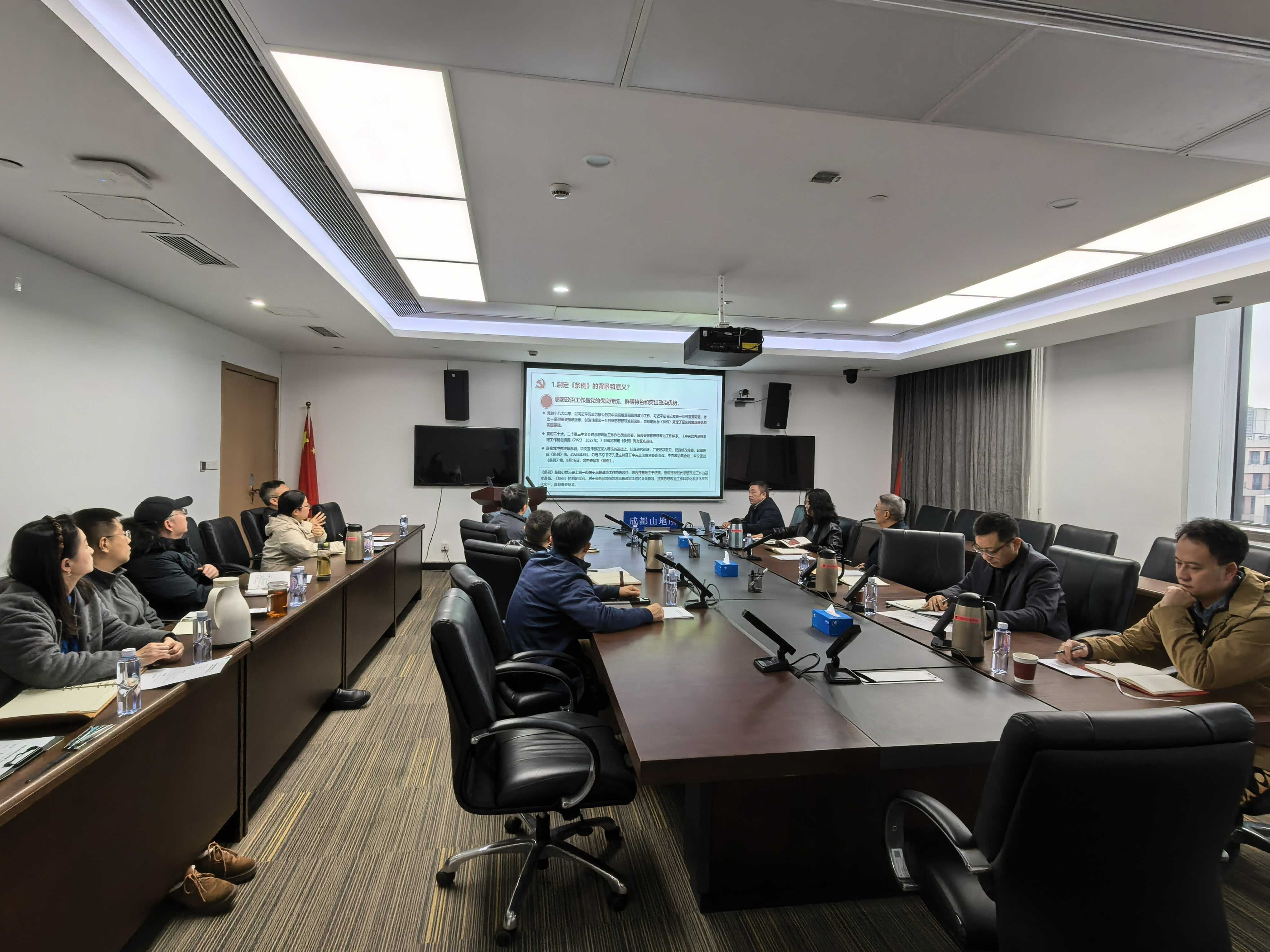 12月24日,成都山地所召开党委理论学习中心组2025年第六次集体学习会,集中学习《中国共产党思想政治工作条例》、中央经济工作会议精神和“推进党的自我革命要做到五个进一步到位”要求,并开展党史专题学习。党委委员、机关管理部门主要负责人参加会议。成都分院分党组副书记曲建升、党建工作处处长胡鹏到会指导。会议由党委书记、副所长谭多财主持。