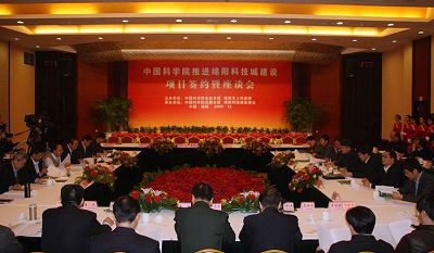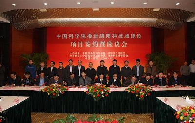 为落实绵阳科技城建设部际协调小组第九次会议精神,充分发挥中国科学院科技国家队的优势,积极支持绵阳科技城建设,由院高技术局、绵阳市政府主办,成都分院、绵阳科技城管委会承办的中国科学院推进绵阳科技城建设项目签约暨座谈会12月1日在绵阳隆重举行。院地双方就加快绵阳科技城建设进行了深入座谈,并成功签订了12项合作协议。中科院副院长江绵恒、阴和俊,院高技术局局长田静、副局长孟丹,成都分院院长彭宇行,成都分院党组书记、副院长袁家虎等出席了会议。四川省方面出席会议的有省政府副省长李成云,省政府副秘书长蔡竞,绵阳市委书记、市人大常委会主任吴靖平,市委副书记、市长曾万明等。