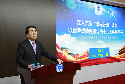 上午的会议中,中科院院长、党组书记白春礼作了题为《深入实施“率先行动”计划以优异成绩迎接党的十九大胜利召开》的会议报告,传达了刘延东副总理1月10日视察中科院时的重要讲话精神,代表中科院党组和院务会议总结回顾了2016年全院工作,对2017年全院总体工作提出要求,并部署2017年全院重点工作。