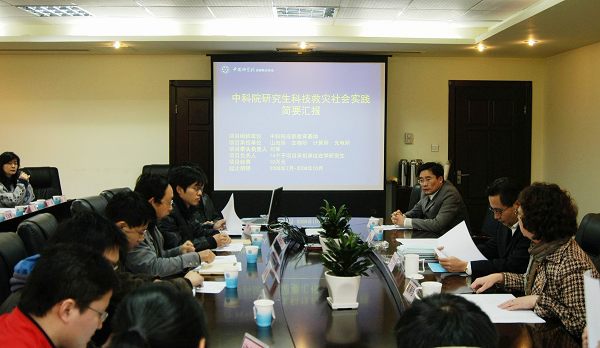 在汇报会上,成都教育基地办公室的负责同志汇报了项目总体组织情况及取得的成果:在四个月的时间里完成了11份相关研究报告,14份社会实践报告,8篇科研论文,其中2篇已被《地质科技情报》接收。14位项目负责人做了补充汇报并谈了他们到灾区调研考察所受到的教育和收获,他们一致表示参加科技救灾专题社会实践项目对他们而言无论是学术研究上还是政治思想上都是一次深化;结合社会实际需求组织开展以项目为载体的社会实践是理实交融,科研和学习的好方法。