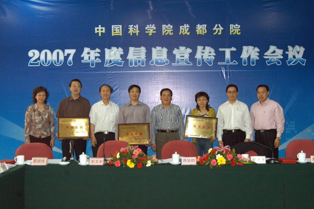 会议对成都山地所等3个2006年度信息宣传工作先进集体和陈炜等7名优秀个人进行了表彰,蒋协助主任和分院领导向先进集体和优秀个人颁发了荣誉证书,并向成都分院11名兼职信息员颁发了聘书。成都分院党组书记彭玉水、副院长赵永涛分别宣读了《关于表彰中国科学院成都分院2006年度信息宣传工作先进集体和优秀个人的决定》和《中国科学院成都分院关于聘任兼职信息宣传员的通知》。