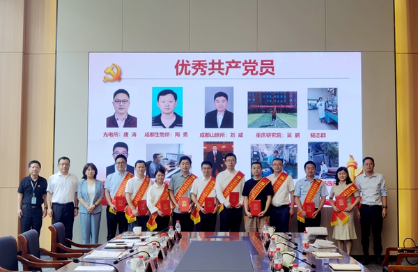 陈锋宣读表彰决定。杨薇薇等25名优秀共产党员、侯方等10名优秀党务工作者和成都分院机关第一党支部等10个先进基层党组织获得表彰。参会领导分别为受到表彰的先进集体和优秀个人颁发了荣誉证书和奖牌。