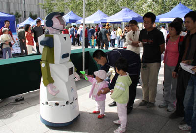 在自动化所展区,记者看到,智能机器人吸引了众多小朋友的目光,一人多高的机器人不但会行走,还会与人握手、拥抱和对话,你看,小朋友们和“他”玩得多开心!