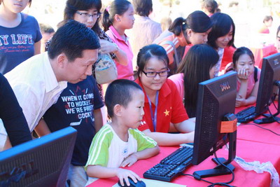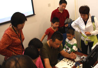计算机网络信息中心的组织的“Hands-On,Minds-On”多媒体互动体验游戏吸引了很多家长带着孩子一起参与进来,在互动游戏中学习甲型HINI流感的防控知识,掌握生态环境保护常识。图为参与互动科学体验游戏的小朋友及家长。