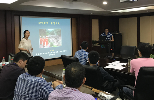 在山地所,王士革研究员带来的“防灾减灾教育为先”主题报告,以实际案例展示呼吁教师们提高地质灾害防治减灾意识。讲座结束后,教师们参观了成都山地所科技展馆与泥石流模拟厅,听取了山地所历史沿革、科学成果及研究特色,共同参与了泥石流灾害演示与防治及不同类型土壤酸碱度对比两门科学体验课程。