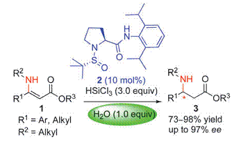 中国科学院成都生物研究所天然产物中心孙健研究员课题组近年来在手性路易斯碱催化不对称还原研究领域开展了系统深入的研究,并取得了一系列原创性研究成果。他们的最新研究发现,利用所设计的新型路易斯碱催化剂可首次实现三氯氢硅对一系列N-烷基β-脱氢氨基酸酯的高对映选择性还原,取得了高达98%的收率和97%的对映选择性,实现了对该研究领域的新突破。特别需要指出的是,他们的研究发现,水的加入对该反应体系获得高收率和高对映选择性至关重要,而通常认为水对这类反应体系是起破坏作用的。