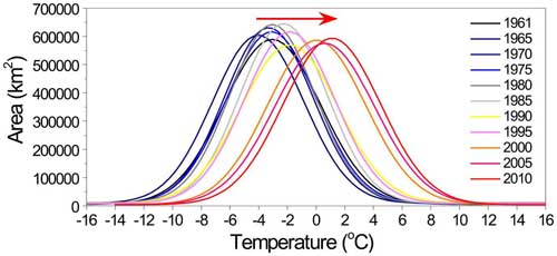 典型年份以2°C为间隔的各个温度区分布曲线及其变化情况
