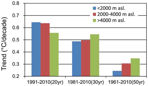 过去20年、30年、50年间青藏高原及其周围地区不同海拔段上的增温趋势