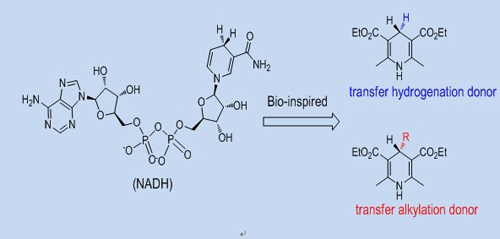 仿生合成即指在分子水平上模拟生物的功能,将生物的功能原理用于化学合成,借以改善现有的和创造崭新的化学原理和工艺的科学。仿生合成以其反应条件的温和化、无污染、立体专一性强、快速催化、副产物少、产率高、能耗低等突出特点和优势成为绿色化学的重要体现。仿生合成的核心内容是酶的利用和化学模拟。NAD(P)H(还原型烟酰胺腺嘌呤二核苷酸及其磷酸酯)是生命体内最重要的氧化还原辅酶之一,起着转移负氢离子或电子的作用。其化学模型都是二氢吡啶类化合物,其最为常用的三种模型化合物为:BNAH(1,苄基-1,4二氢烟酰胺)、HEH(1,4-二氢吡啶)、AcrH2(N-甲基-9,10-二氢吖啶)。其中HEH因其易于制备,毒性小,较稳定,便于储存,可以与许多有机催化剂兼容等特点常用于一些基团的选择性还原以及不对称氢化还原。