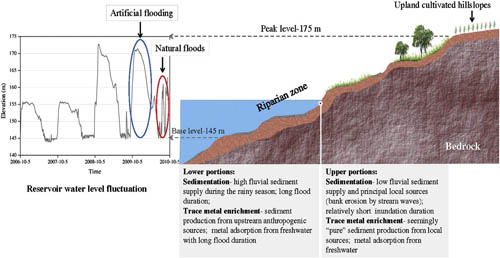 三峡水库蓄水运行在坝址宜昌至库尾重庆间形成了垂直落差达30m (145m-175m)、总面积达349km2的水库消落带。蓄水导致水库流速减缓,水位周期性地涨跌导致消落带发生泥沙沉积。三峡水库消落带泥沙沉积决定其地貌演变过程,同时伴随着污染物的累积和释放过程。揭示三峡水库运行初期消落带泥沙沉积过程和元素富集特征有助于分析水库特定水位调节模式的影响,具有重要的科学价值和现实意义。