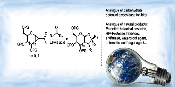 中国科学院成都生物研究所邵华武研究员课题组与加拿大国家研究院合作,对环丙烷糖类化合物的[3+2]环加成反应进行了探索,取得了一系列原创性研究成果。他们发现以1,2-环丙烷糖类化合物为底物,使用催化量的InCl3或SnCl4能够与醛酮类化合物发生[3+2]环加成反应,得到各种不同的呋喃并吡喃和呋喃并呋喃化合物。同时,该反应也广泛适用于不同的官能团,而且具有反应收率高和非常优异的立体选择性。