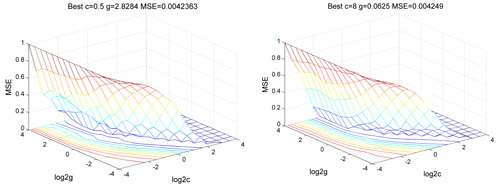 网格搜索法确定的滑坡单因素和多因素SVM模型参数c和g的3D等值线图