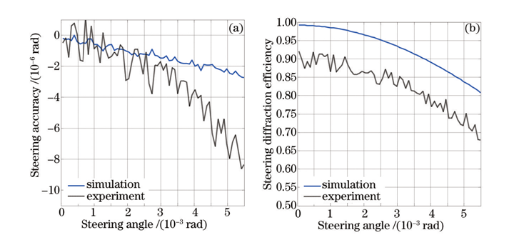 (a)偏转精度与偏转角度的关系 (b)偏转衍射效率与偏转角度的关系