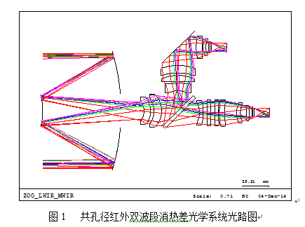 中国科学院光电技术研究所应用光学研究室廖胜课题组在共孔径宽光谱红外双波段消热差光学系统研究上取得新进展:提出了一种共用光路部分为透镜和反射镜相结合,利用二色分光镜实现分光探测成像,通过巧妙搭配合适的光学材料、机械材料和分配光焦度,可实现两个支路系统在较宽温度内取得良好成像性能的共孔径红外双波段消热差光学系统结构形式。