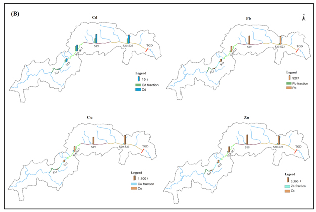三峡库区沉积物中重金属(Cd、Cu、Pb和Zn)的浓度总体上低于我国东部发达地区河流中的水平。消落带沉积物中Cd的浓度随着离大坝距离的减小而逐渐增加,而Cu、Pb和Zn的浓度以及水下沉积物中重金属的浓度没有呈现明显的空间分布趋势。消落带沉积物中重金属的储量主要集中于库区中段,而水下沉积物中的储量则集中于靠近坝区的区域,说明沉积物的输入量决定了重金属在库区中的分布。利用Pb同位素示踪和金属分类学等手段,发现沉积物中重金属主要与当地的人类活动有关,证明夏季的降水增加有助于当地污染物随地表径流进入库区,进而在沉积物中累积。沉积物中可溶态的Cd占总Cd的50%以上,说明Cd具有较高的迁移性,而其它重金属的迁移性均较低。多污染指标进一步揭示了Cd处于较高的污染水平,而其它重金属的污染程度均较低。与其它重金属相比,未来更需要关注Cd在三峡库区的污染和生态风险。