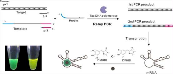 该方法原理如下:首先,在对目标DNA进行PCR时,由于Taq DNA聚合酶具有5’-3’的外切酶活性,它能在引物的延伸过程中于探针和目标DNA杂交的位置将探针的5’突出末端剪切,产生一个小DNA片段。此片段释放出来后可作为反应体系中另一个DNA模板 -- 报告模板的引物,进一步启动报告模板的PCR。报告模板为编码RNA适配体--绿色荧光蛋白(GFP)RNA类似物--的序列,在PCR结束后,报告模板的PCR产物可以转录mRNA,在相应的荧光基团存在下可以产生荧光信号。该方法已成功应用于大肠杆菌和产气荚膜梭菌的检测中。