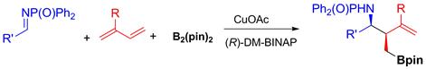 中国科学院成都生物研究所廖建研究员课题组在前期工作基础上(J. Am. Chem. Soc. 2015, 137, 13760; Chem. Eur. J. 2015, 21, 4918),实现了共轭二烯、联硼片那醇酯和亚胺的高活性,高支链选择性、高非对映选择性、高对映选择性的偶联反应(高达99 % 收率,大于20/1 非对映选择性和99 % 对映选择性)。反应以廉价易得的工业原料1,4-丁二烯为反应底物,合成了β-硼取代,具有两个相邻手性中心的手性高烯丙基胺。这类含氮有机硼试剂可以进一步转化为手性氨基醇、手性四氢吡啶类等有用的分子。该研究为手性高烯丙基胺合成及烯丙基金属试剂制备提供了新的思路。
