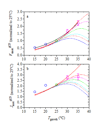 最大羧化速率Vcmax和电子传递效率Jmax对不同生长温度格局的响应曲线(以25℃为基准表示)
