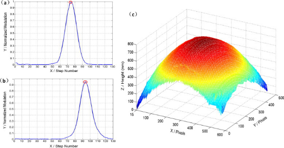 光电所科研人员提出一种基于白光显微干涉术的形貌恢复算法:利用二维傅立叶变换获取单帧干涉图像频域信息,提取基频频谱作逆傅里叶变换,最后获取条纹的时域调制度信息。通过压电陶瓷纵向高精度扫描,获取每个像素点的调制度分布,进而利用极值点得到单个像素点的高度信息,从而实现微纳结构的三维形貌重建。该方法优势在于能有效消除光源光强不稳定、外界环境干扰等不利因素带来的误差,较大程度上提升检测精度和系统稳定性,未来有望应用于在线检测。