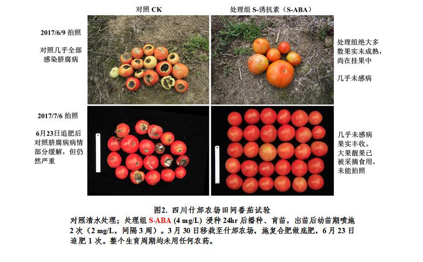 中科院成都生物所谭红研究员团队大量田间试验发现,使用低浓度外源S-ABA (以下简称ABA,2~4 mg/L)处理作物后,能显著提高多种作物的广谱抗病特性。
