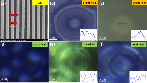 光电所研究团队近期发展出一种利用暗场显微有效提高成像高频成分含量的方法,具有降低成像低频成分的特点,结合微球超分辨能力,可实现更高对比度的微结构超分辨显微。该方法通过时域有限差分法模拟分析微球在不同浸没方式、浸没深度情况下的半高宽及光强值等来得到更优化的超分辨能力,模拟结果如图1所示。在此基础上通过二氧化硅和钛酸钡微球在不同浸没情况下观察特征尺寸为139 nm的硅光栅结构,实验结果如图2所示。可以看出,在暗场显微时成像对比度明显得到增强。