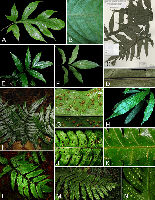 牙蕨科Pteridryaceae科四个属部分种类 (A, B. Draconopteris draconoptera; C, D. Malaifilix grandidentata; E–G. Polydictyum variabile; H. Polydictyum menyanthidis; I–K. Pteridrys australis; L. Pteridrys cnemidaria; M. Pteridrys hanoiensis; N. Pteridrys vietnamensis)。