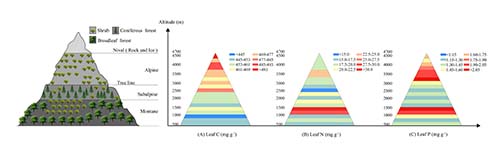 青藏高原灌丛叶片碳氮磷含量的垂直分布图