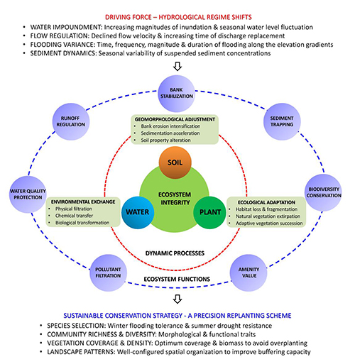 研究表明,消落带是三峡水库重要的生态功能带,具有固土护岸、调节坡面径流、拦截坡面泥沙和降解污染物等一系列重要的生态功能。植被恢复及其生态功能重建是当前有效的消落带生态修复手段。植被恢复筛选适生物种对淹水胁迫和抗旱条件耐受性是基本前提,同时根据形态和功能性状建立多样化的种群;结合保护目标形成最佳盖度及种群密度,避免过度恢复导致淹水期营养元素大量释放,形成污染风险;强调景观格局构建下的缓冲带功能最优化,达到护土固岸、调节坡面径流和拦截泥沙、降解污染物的作用。
