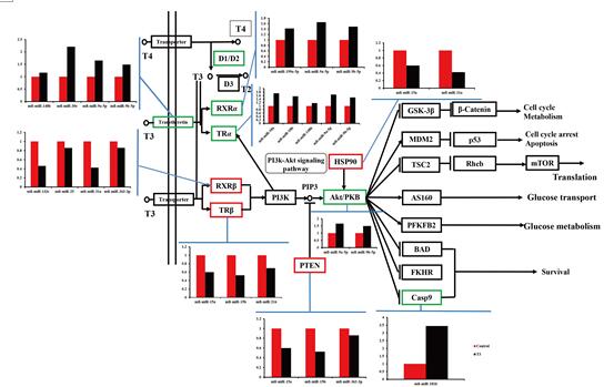 以饰纹姬蛙转录组unigene为靶基因文库,用miRanda(3.3a)对21个显著差异表达miRNA进行靶基因预测,共预测了10,206 unigenes为差异miRNA的靶基因,对这些基因进行功能富集发现,PI3K-Akt通路被显著富集。一个复杂特异的miRNA:mRNA互作网络图可以更清晰的揭示它们的相互关系,于是我们利用转录组数据、miRNA文库表达量、miRNA-靶基因的调控关系,构建了TH通路miRNA-靶基因的调控网络。共有10个显著性差异表达的靶基因参与TH信号通路,其中HSP90, PTEN, RXRβ和TRβ为上调,而TRα, RXRα和type I iodothyronine deiodinase (D1)和 transthyretin下调。在这个通路中,上调的mfi-miR-10a, mfi-miR-10b, mfi-miR-148b, mfi-miR-9a-5p和 mfi-miR-9b-5p通过调控TRα表达调节变态发育过程。TH通路中PI3k-Akt信号通路在靶基因KEGG富集分析中也被显著富集了。Casp9-mfi-miR-181b的相互作用也通过TH通路调控饰纹姬蛙的变态发育。