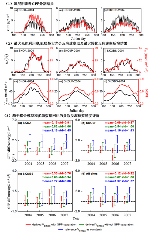 近期,成都山地灾害与环境研究所山地定量遥感研究团队李爱农研究员及其博士研究生谢馨瑶等选择北美加拿大三个森林观测站点数据(Saskatchewan Old Aspen, Saskatchewan Jack Pine, Saskatchewan Old Black Spruce)和Boreal Ecosystem Productivity Simulator (BEPS)模型为基础,构建了基于BEPS生态过程模型和光反应曲线的耦合模型,提出了一种基于碳通量观测数据和耦合模型的阳叶GPP反演方法,成功实现了一种基于多源遥感数据同化的碳循环过程关键参量研究框架。