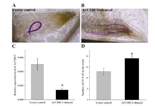 图1:沉默AeVTDC1导致根部侵染的CCN数目显著增加