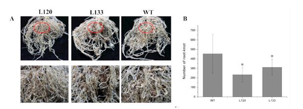 图2: AeVTDC1转基因烟草根部根结数目显著少于对照