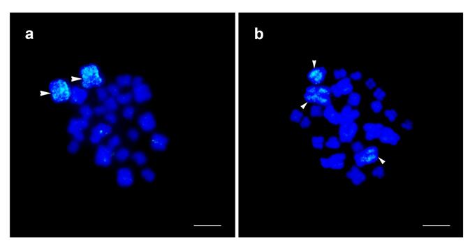 棘腹蛙染色体正常核型及易位核型的涂染结果。