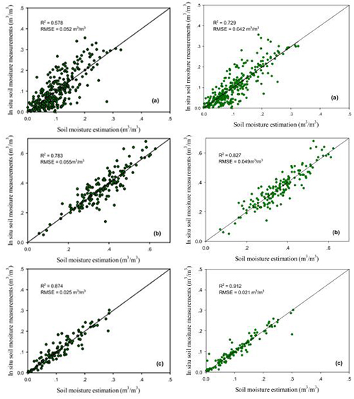 传统土壤水分估算模型反演结果(左列)与改进模型估算结果(右列)