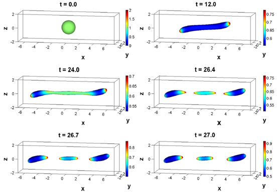 剪切流作用下表面活性剂覆盖的液滴的分裂过程的模拟(颜色表示表面活性剂浓度)