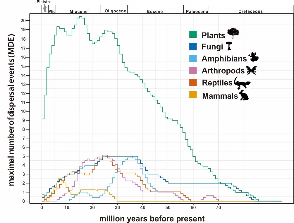本研究进一步揭示了欧亚大陆和北美大陆之间不同生物类群的扩散事件具有不同的高峰期。由于在古新世和始新世早期,混合落叶阔叶林和常绿亚热带森林的北方热带植物区系带广泛分布于北半球,白令陆桥在这段时间是主要的扩散通道,此时适应温暖环境的生物类群包括两栖动物、爬行动物和昆虫在这期间的扩散事件中占主导地位,两栖动物的扩散非常显著。昆虫、爬行动物、两栖动物和真菌在两大陆间的生物交换发生的时间(~40-25 Ma)比植物和哺乳动物更早(~25-8 Ma)。