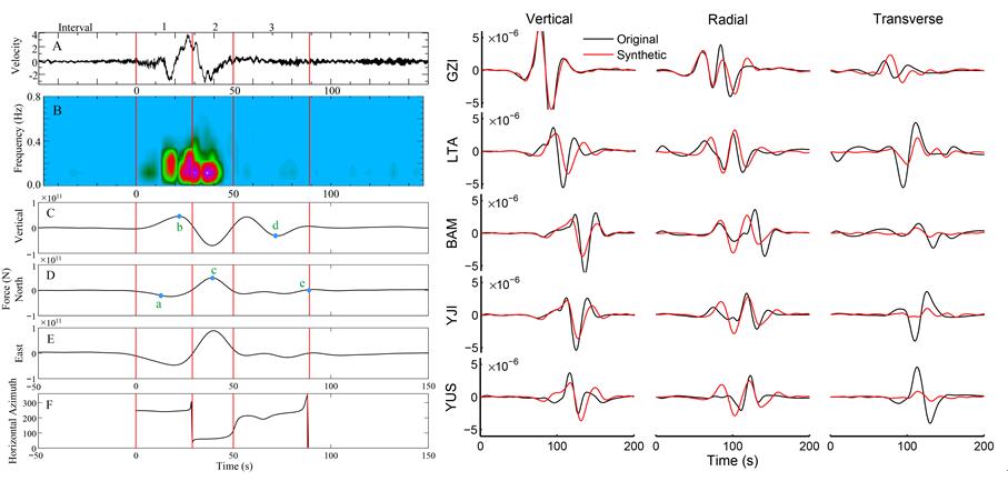 反演得到的白格滑坡的力时间函数以及实测与模拟的地震波形
