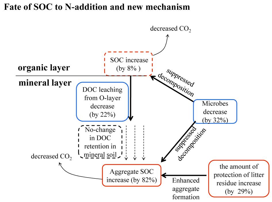 大气活性氮沉降增加是当前及未来我国所面临的主要环境问题之一。当前研究认为氮沉降增加可促进森林土壤碳积累,其解释机制可能包括三个方面,一是氮沉降可通过抑制森林土壤木质素酶(如过氧化物酶)等酶活性而降低木质素等物质分解速率,从而增加土壤碳积累;二是氮沉降一般会造成土壤酸化,从而抑制土壤微生物生长及其对土壤碳的分解;三是氮沉降下矿质土壤对淋溶碳吸附增强,进而促进碳积累。然而,以上解释在不同氮沉降阶段以及不同森林生态系统中可能存在较大差异,相关研究匮乏。针对上述问题,中科院成都山地灾害与环境研究所常瑞英副研究员及合作者依托贡嘎山亚高山针叶林长期氮沉降实验平台,较为系统地阐述了上述三种机制在森林土壤碳积累中的作用,并基于观测结果提出新的机制认识。