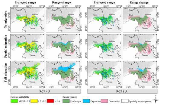 以往对冷杉未来分布的研究主要集中在广阔的平原地区(北美及欧洲),得出的结论相对一致,即其潜在分布的范围在缩小并向北方迁移。与北美、欧洲等区域相比,我国西南地区由于地形、气候、植被和物理屏障的巨大差异,且冷杉物种数量占全球的四分之一以上,这使得我们对多个物种的评估与其他区域的相关研究有可能有很大的不同。并且很少有研究试图阐明不同的迁移能力对东亚气候变化下植物潜在分布的影响。因此,考虑到迁移限制和气候变化之间的相互作用,迫切需要对我国西南山地的多个冷杉树种进行可靠的未来评估。