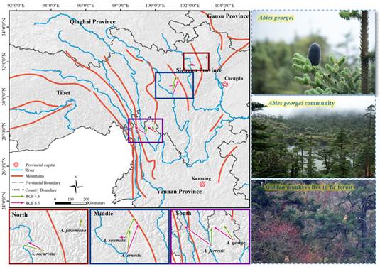 中国科学院成都生物研究所生态过程与生物多样性组的博士研究生廖梓延在导师潘开文研究员和张林副研究员的指导下,联合了瑞士联邦研究院(Swiss Federal Research Institute WSL)的Michael Peter Nobis研究员,采用最大熵(MaxEnt)算法校准生态位模型,并基于两种碳排放情景(RCP 4.5和RCP 8.5),分别预测我国西南山地北部(“北方”)典型代表性建群树种岷江冷杉和紫果冷杉,中部典型代表性建群树种鳞皮冷杉和黄果冷杉,南部(“南方”)典型代表性建群树种川滇冷杉和长苞冷杉,在未来三个时间段(2021-2040年、2041-2060年及2061-2080年)的潜在分布变化。首次在植物分布变化预测中采用KissMig迁移模型,制定了三种迁移场景(完全迁移、不迁移和局部迁移场景),来探讨迁移能力与预测分布之间的关系以及重要冷杉树种的潜在分布。