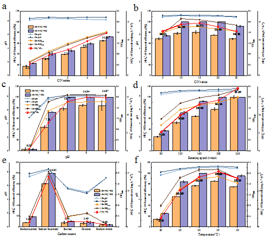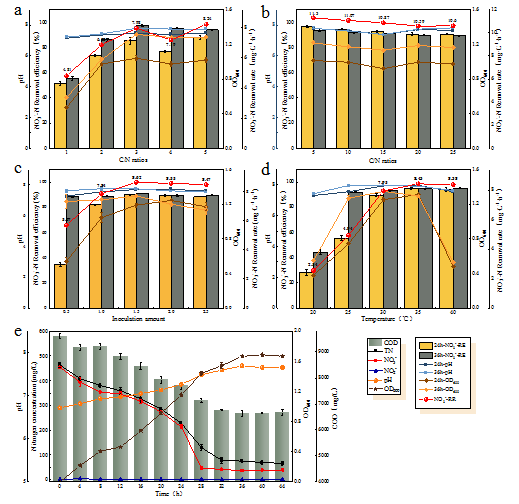 图2菌株HY-1在厌氧条件下的单因素优化及反硝化分析