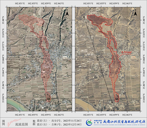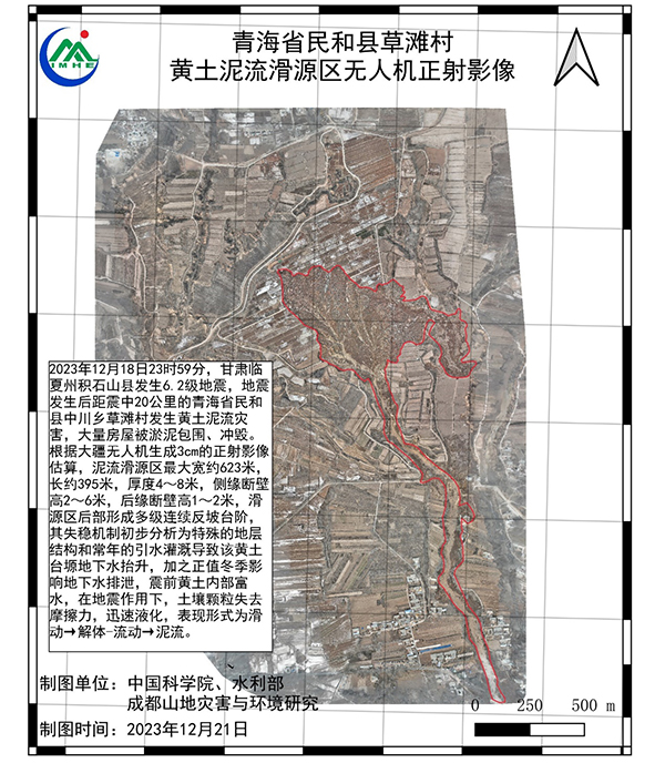 “12 18”甘肃积石山6.2级地震导致距震中20公里的青海省民和县中川乡金田村、草滩村发生地震滑坡-泥流灾害链灾害。成都山地所应急减灾团队于20日抵达草滩村灾害现场。截至目前,已完成灾害调查、隐患点分析、现场无人机作业及数据处理,并初步完成成灾机理研判。